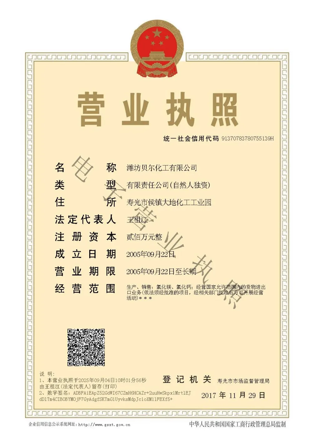 Registered address : Dadi Chemical Industrial Park, Houzhen Weifang Shandong China